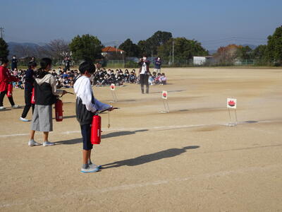 また、各クラス1名ずつ、消火器体験を行いました。「火事だ!」と大きな声で助けを呼び、訓練用の水消火器で的をねらって放水しました。緊張しながらも、一生懸命消火訓練を行っていました。
