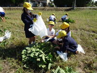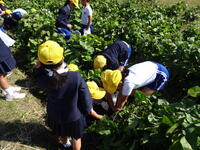 総合的な学習の時間で育てている大豆。大きく育ち、立派な枝豆がたくさんできました。秋晴れの中、3年生で収穫しました。