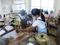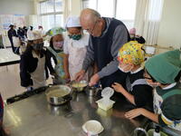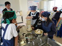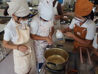 小野商店街の森本豆腐店の森本さんに来ていただき、豆腐作りを教えていただきました。大豆と水をミキサーで混ぜて、鍋に移し2分間ゆっくりかき混ぜながら、火にかけます。布に移してギュッと絞り、豆乳とおからにわけます。豆乳をもう一度火にかけてぐつぐつしてきたら、森本さんににがりを入れてもらいます。ぷるんと固まるとできあがり!子どもたちは役割分担をしながら、協力して豆腐を作ることができました。できたての手作り豆腐は味も格別で、おいしくいただきました。