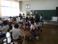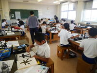 大阪府池田市のダイハツ工場から8名の講師の先生に来ていただき、出前授業を実施していただきました。事前に社会科で自動車工場で働く人々の様子や自動車が出来上がるまでを学び、実際に今回は体験しながらものづくりの大切さや楽しさをたくさん教えていただきました。教科書では分かりにくい製造工程の原理を実物の部品や工具を「見て」「触って」「使って」体験させていただき、とても充実したよい時間となりました。ダイハツ工場のみなさんありがとうございました。