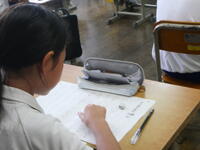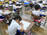 9月16日㈫に書写の出前授業がありました。大筆と小筆に苦戦しながらも何度も練習して、「水玉」をみんな丁寧に清書することができました。