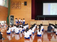 8月29日(金)に児童朝会がありました。今月のお話は、戦後80年を迎えた日本に住む私たちが、改めて「平和」について考えるというものでした。児童会の子どもたちが、『へいわってすてきだね』という絵本を読み聞かせし、「平和」について考えたことを、資料館に行ったり本で読んだり家族に話を聞いたりしたことを基に、自分の言葉で発表してくれました。8月5日(金)には、5年生がオンラインで戦争の語り部さんのお話を聞きます。これからもみんなで考えていきたいです。