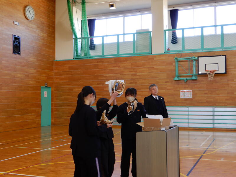1月17日水曜日にロサンゼルスドジャースの大谷 翔平選手から送られてきたグローブが本校にも到着しました。全校児童の前で、児童会役員が開封し、早速スポーツ少年団野球部の児童にキャッチボールのデモンストレーションをしてもらいました。これから、各クラスで一人一人がグローブを手に取り、大事に使っていきます。
