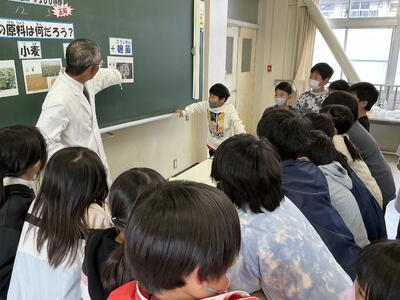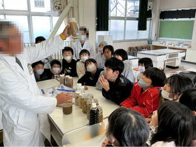 12月17日(水)、ヒガシマルからしょうゆもの知り博士の方を講師にお迎えし、しょうゆのつくり方や特徴について出前授業をしていただきました。