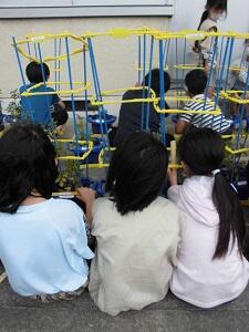 6月に入ると、「先生!ミニトマトができてる!」という声が。緑色のかわいいミニトマトができ始めてきました。写真は、算数で習ったばかりのものさしを使って、茎が何センチまで伸びたかを測っているところです。緑色の実が赤くなり、食べられる日が楽しみですね。