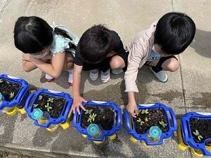1年生は5月中旬からあさがおを育てています。土入れをして種まきを行い、あさがおの芽が出てきました。