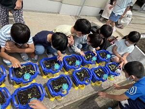 自分で育てているあさがおに興味津々の子どもたちは、触ったり、においをかいだり、「大きくなあれ」と願いを込めながら観察を行いました。