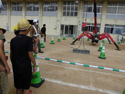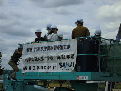 5月25日(木)に工事現場体験学習を行いました。国道175号線の道路工事を請け負っている、酒井工業株式会社さんが高所作業車やカニクレーンを、大部小学校に持ってこられました。