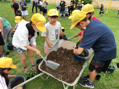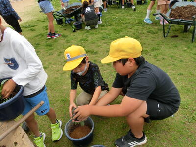 4年生はなかよし学年の2年生のお世話をしながら、自分たちの苗の植え替えもしました。