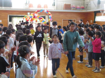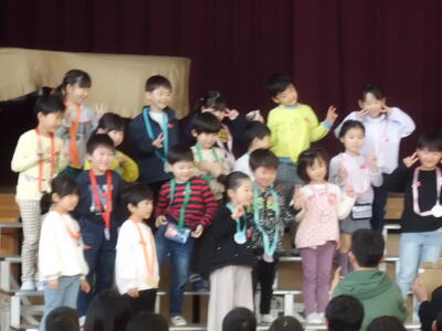全校生から歓迎の歌を歌ってもらったり、6年生から歓迎メダルをもらったりして、とてもうれしそうな1年生でした。