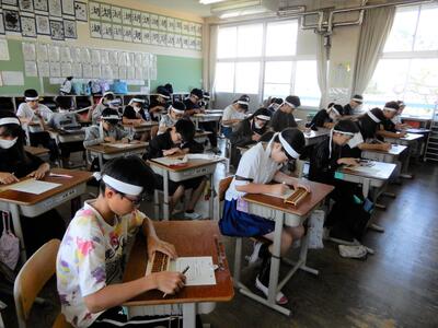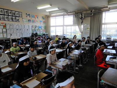 子どもたちはハチマキを巻き、気合を入れて体育館に集まってきました。そして、1・2年生は百玉そろばん、3~6年生はマイそろばんに向き合い、用意された計算問題に一生懸命取り組みました。体育館内にはそろばんをはじく音だけが響きます。脳の前頭前野が活発に活動していたことでしょう。子どもたちの成長を感じる時間でした。