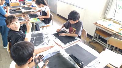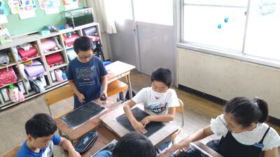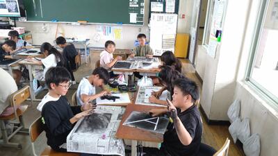 2年生の児童よりも大きな紙を「くしゃくしゃにしていいですよ。」というと、みんなの顔が輝きました。みんな思い思いにくしゃくしゃにして、それからまた広げました。次に、下の写真は袋にしているところです。紙をきれいに伸ばして、ボンドで懸命に貼っています。みんなとっても真剣です。そして、楽しそうです。この後は、袋の中に新聞紙を入れ、紐でしばって作品にしあげていきます。がんばります。