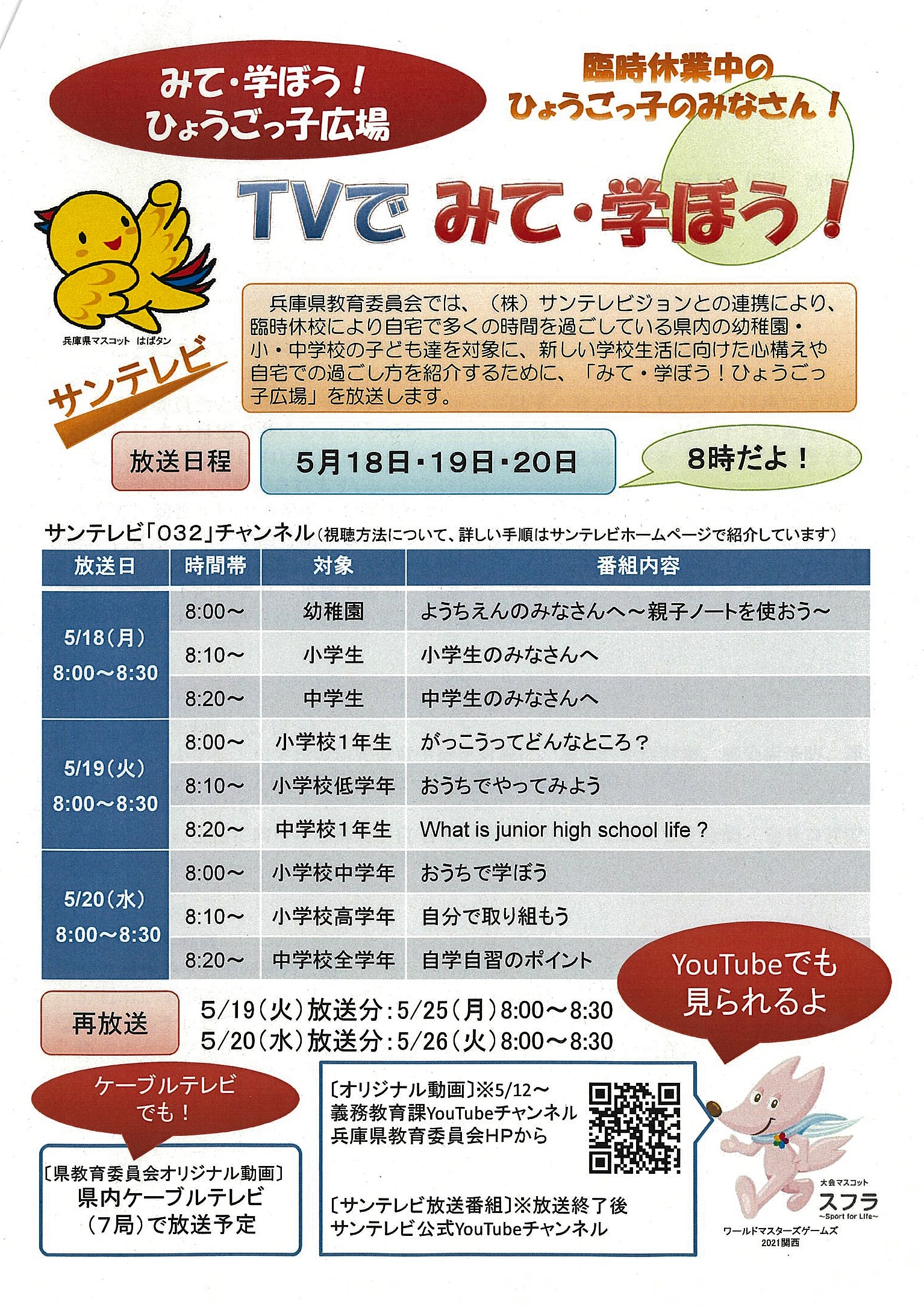 兵庫県教育委員会と、(株)サンテレビジョンとの連携により、臨時休校により自宅で多くの時間を過ごしている県内の幼稚園・小・中学校の子ども達を対象に、新しい学校生活に向けた心構えや自宅での過ごし方を紹介するために、「みて・学ぼう!ひょうごっ子広場」が放送されます。