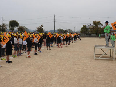 交通安全教室を実施しました。登校旗の使い方や交通安全についてのお話を聞きました。