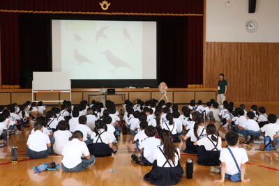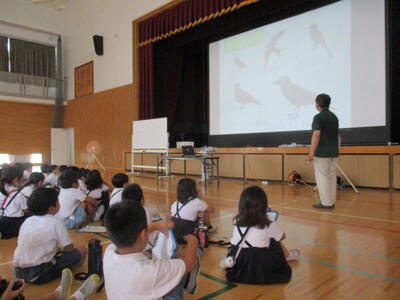 3年 が環境体験学習で、人と自然の博物館講師 小舘先生に来ていただき、ツバメをはじめとする野鳥について詳しくお話を聞きました。