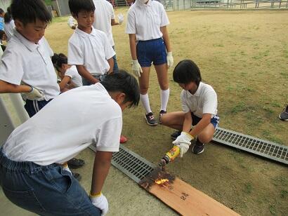 火起こしを体験し、杉板を焼いて焼き板づくりもしました。