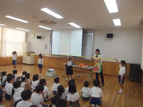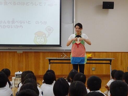 ごはんの大切さ、腸の仕組みなど、「体の中エプロン」を使ってくわしく教えてくれました。