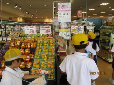 スーパーマーケットを見学して、そこで働く人の仕事の内容や工夫を調べたり、売り場のひみつを見つけたりしました。