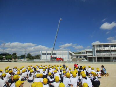 校舎よりはるか高く30mまで伸びる、はしご車を実際に動かしていただきました。