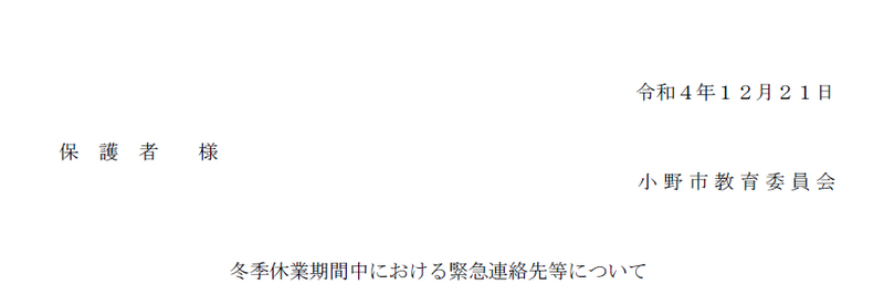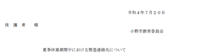 見出しのことについて、兵庫県小野警察署長を通して、兵庫県警察本部生活安全部から別添の内容について保護者周知の依頼がありました。