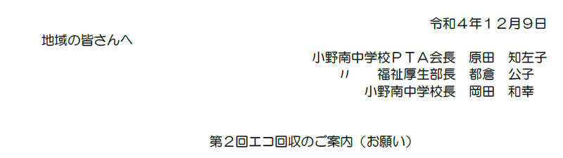 令和5年度 1月13日 第二回 エコ回収についてお知らせ