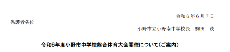 令和6年度小野市中学校総合体育大会開催についてお知らせいたします。