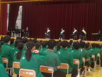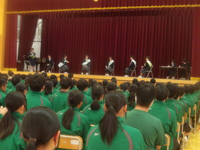 令和7年12月2日(火)、初の試みで、12月4日に行われる生徒会本部役員選挙に立候補している生徒による集団討論会を行いました。全校生の前で大変緊張したと思いますが、生徒会本部役員になったらどんな学校にしていきたいのか、どんなことに取り組んでいきたいのか、それぞれの熱い思いを討論形式で語ってくれました。全校生も真剣なまなざしで聞き入っていました。出演者にとっては、選挙の結果に関係なく貴重な経験となりました。