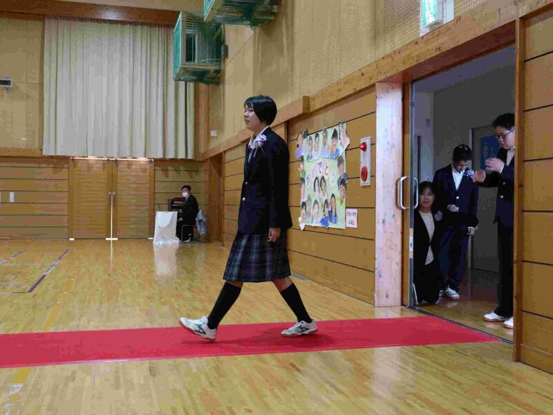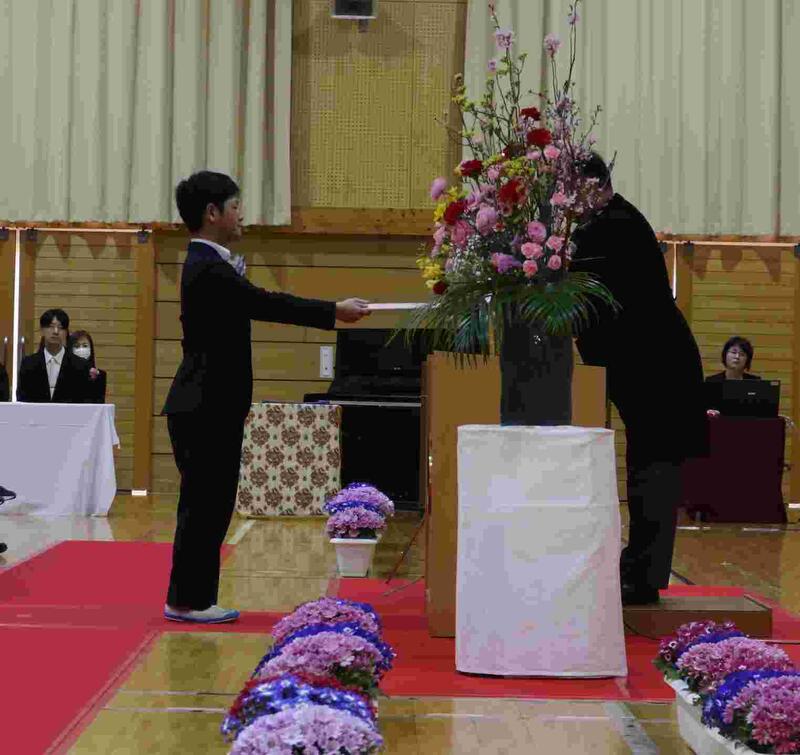 体育館では、在校生、保護者の方々などの多くの人に見守られ、一人ひとりが胸を張って入場し、卒業式が始まりました。返事や立ち姿、表情からこれまでの頑張りや成長を感じます。卒業証書を手に持ち、立派に卒業していく姿をみんなでお祝いすることができました。