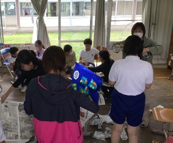 高学年は布袋の中に破った新聞を詰め込んで、鯉のぼりを作ります。まずは、破りに破った新聞を両手いっぱいにすくい、みんなで放り上げて紙吹雪を楽しみます。最後に、部屋いっぱいに広がった新聞を丸めて鯉の口へ。ふわふわ鯉のぼりが完成です。