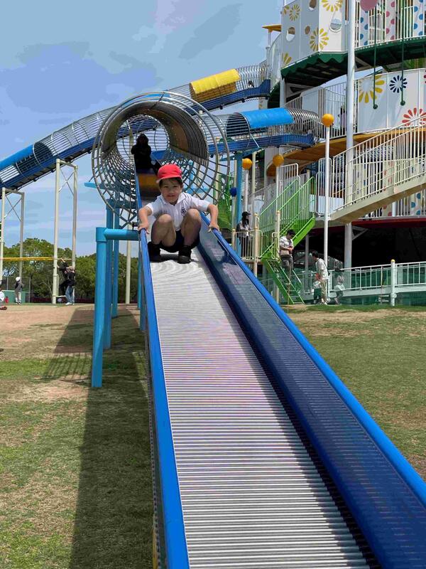 見事なまでの快晴で、ひまわりの丘公園へ行きました。青と緑のまぶしい陽射しの中、関西最大級の多彩な遊具に、あそび方自由な子どもも大満足!飛んだり跳ねたり、登ったり滑ったり、あっちへこっちへ・・・飽きることなく走り回りました。