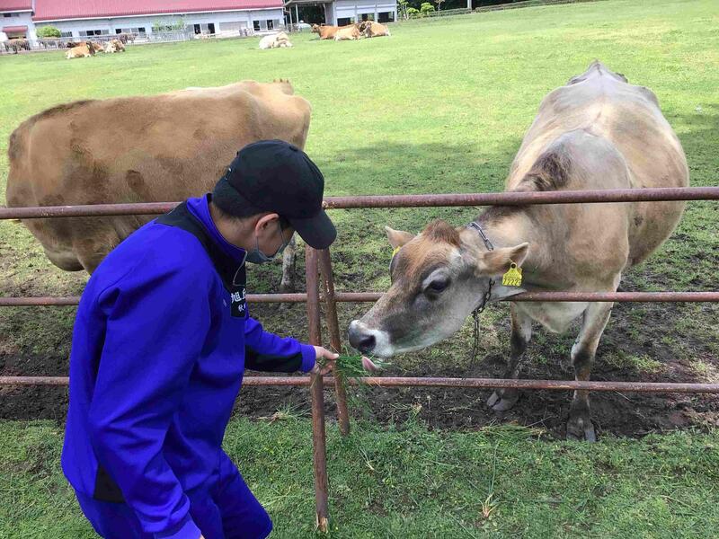 昼食後、中学部はファミリー共進牧場へ行きました。牛たちはまだ昼食中のようです。「ンモゥ~」と鳴きまねをすると、牛たちが集まってきました。生徒たちは、新鮮でおいしそうな草を見つけては牛の口へ運んでいました。最初は怖がって牛の足元に草を投げていた生徒も、少しずつ牛に近づけるようになりました。