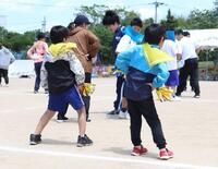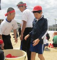 高学年と中学部は「綱を持て。」の合図に「やー!」と気合を入れ、リーダーの旗振りに合わせて綱を引きました。