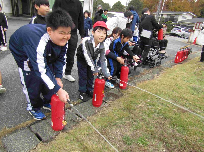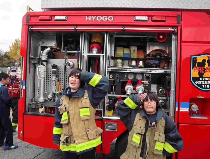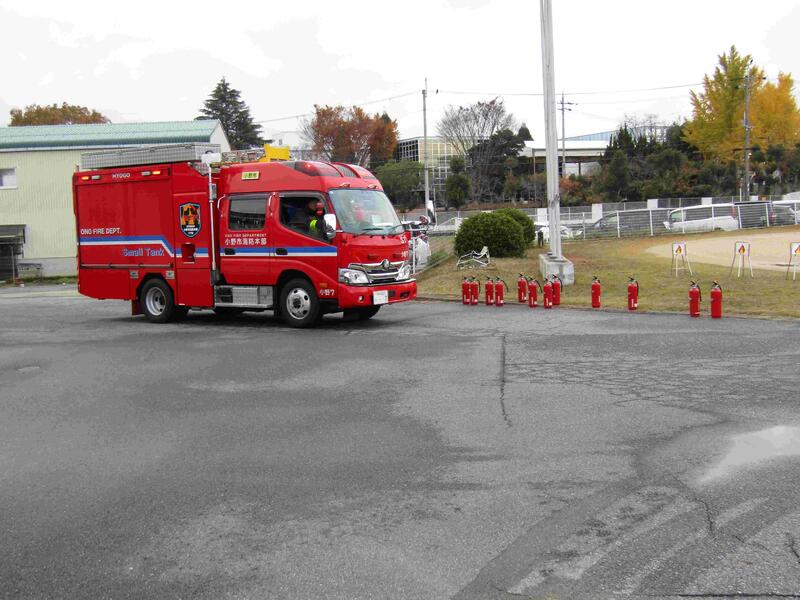 その後は、消防車がサイレンを鳴らしながら学校まで駆けつけてくださり、大きなホースで消防士さんが放水する姿に子どもたちも興奮していました。また、消火器を使った放水体験、消防士さんの服を着たり、消防車にのせてもらったり、たくさんの準備をしていただきました。楽しく防災について学ぶことができる機会となりました。小野市消防本部のみなさん、本当にありがとうございました。