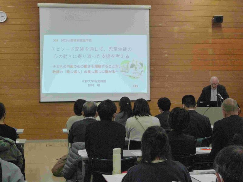 京都大学名誉教授 鯨岡峻先生にお越しいただき、エピソード記述を通して、『児童生徒の心の動きに寄り添った支援を考えるー子どもの内面の心の動きを理解することが、教師の「映し返し」の良し悪しに繋がるー』という演題で講演会を開催しました。小野市の先生方をはじめ、他市の特別支援学校、児童発達支援等関係機関の方々にも参加いただき、講演会、検討会を行いました。