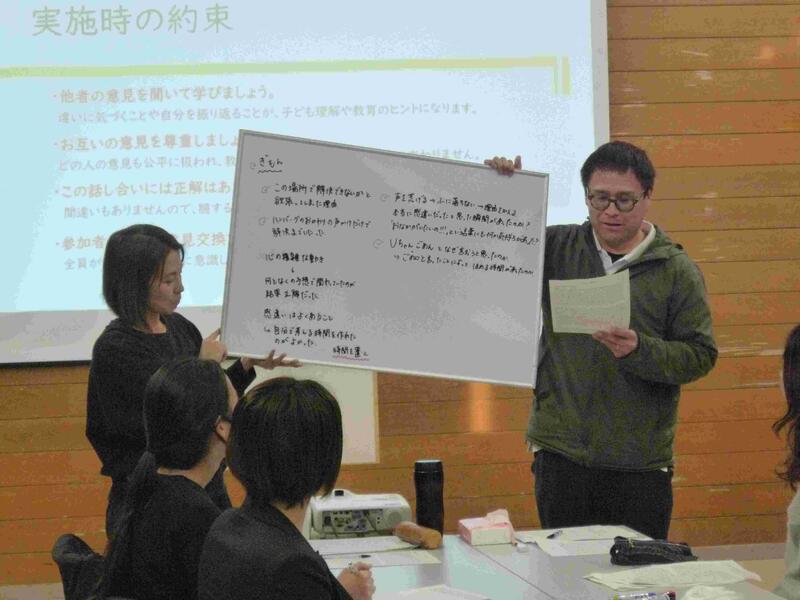 その後は、検討会を行いました。様々な立場の方とエピソードを読み、グループ協議、発表を行いました。他者の意見を聞くことで、自分にはない子どもの見方、視点を得ることができました。明日からの子どもとのコミュニケーションの中で、心の動きを理解できるよう、生かしていきたいと思います。