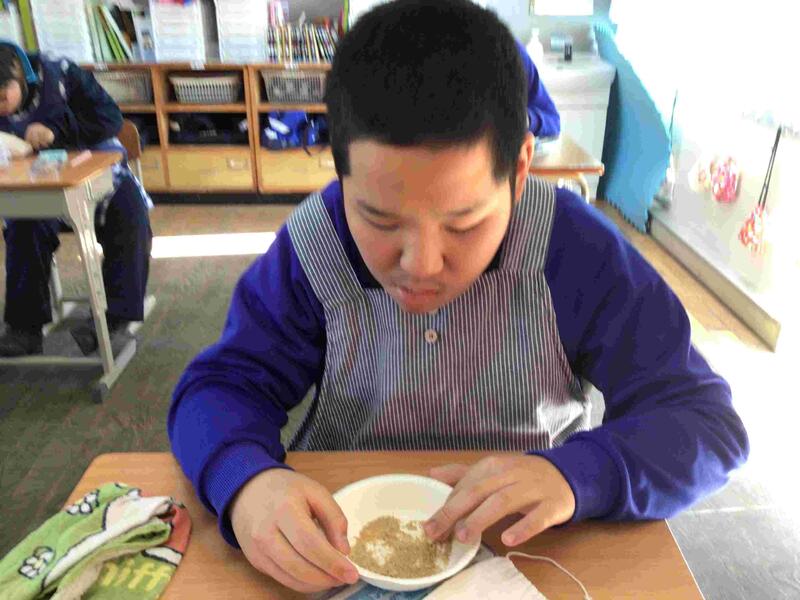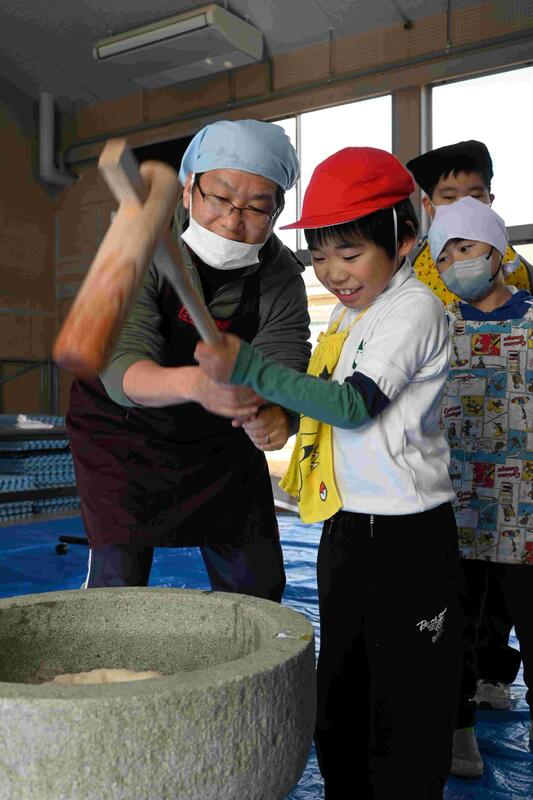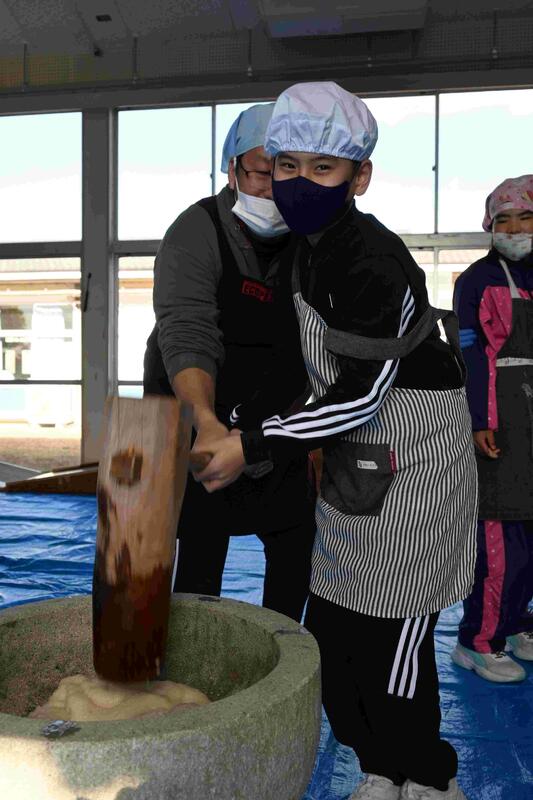 みんなでもちつきにチャレンジしました。身支度をして、目の前に並ぶ大きな臼と杵、ほかほかのもち米に待ちきれない様子です。一人一人、ぺったんぺったんと順番にもちをついていきました。周りで見ている子どもたちも応援しながら、もちが出来上がるのを楽しみに見ていました。出来上がったおもちは、きなこ、あんこ、砂糖醤油から好きな味を選びました。つきたてのおもちはやわらかく、みんなで美味しく食べました。