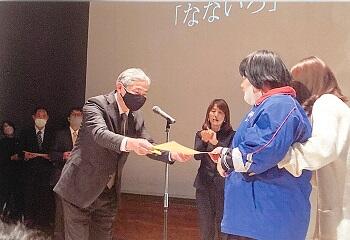会期の最終日は藤原菖さんが美術館で表彰状を受け取りました。ステージの上で表彰状と盾を持ってニッコリ。卒業前の思い出をまた一つ刻みました。