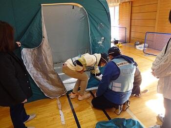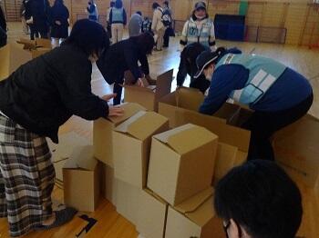 児童生徒は、10時に運動場に避難をし、防災リーダーの方の話や、水道部の方からの給水車の説明を受けました。その後、各クラス単位で給水車体験、煙体験をしました。震災による火事や断水の時のことを想定した貴重な体験となりました。また、体育館では、保護者の方対象に防災グッズ作りやワンタッチパーテーション、段ボールベッドの作成と主に避難所設営に関わることを体験していただきました。