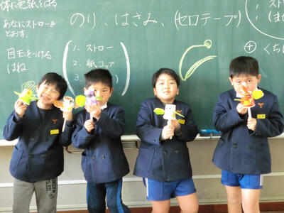 生活科で磁石や輪ゴム、風の力などをつかって遊ぶおもちゃを作っています!