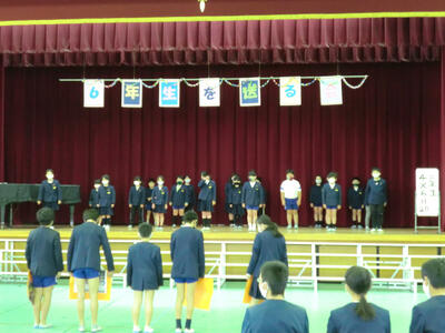 修了式。1番早く体育館に集まりました。この1年でたくましく成長しました!