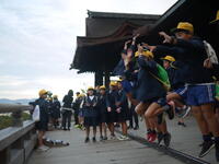 だれもいない清水の舞台。法隆寺に続き、修学旅行生一番乗りで参拝スタートです。